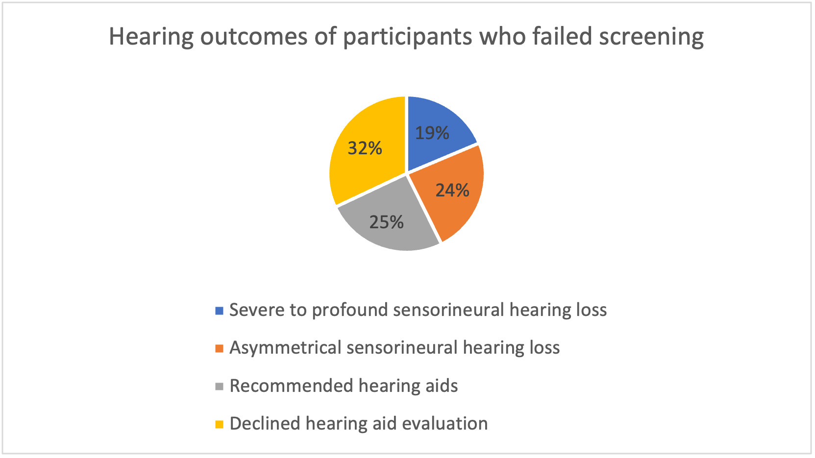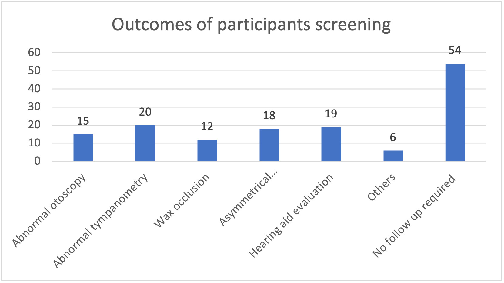 More than half the participants failed the audiometric screening protocol at 40dbHL across four frequencies (75/129; 58.1%), leaving 54 participants (41.9%) who likely have not more than a mild degree of hearing impairment and hence did not require urgent follow up. Of the 75 participants who failed the screening, 11(15%) had bilateral severe to profound congenital hearing loss with one participant noting a history of diagnosed cochlear nerve aplasia. 3 (4%) participants had adult onset, post-lingual deafness with severe to profound sensorineural hearing loss in one or both ears. 18 participants (24%) had asymmetrical sensorineural hearing loss type while 19 (25%) accepted further hearing aid evaluation. The remaining 24(32%) declined hearing aid evaluation.