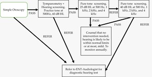 Participants were recruited from a region wide call by the Department of Health and EyeHear foundation. They first underwent a simple intake interview where they were asked about whether they experienced tinnitus and/ or ear discharge as well as whether they were currently working. The Hearing Handicap Inventory for the Elderly-Screening (HHIE-S) was then administered for those who were not working. Following this, participants then undertook video-otoscopy and when results were abnormal, they were referred to the regional medical center for further medical attention. Tympanometry was carried out for those who passed otoscopy examination to assess the middle ear before audiometric screening. We utilized a two-step screening protocol to assess 4 frequencies at 25dbHL and 40dbHL. Details of the screening protocol can be found in Figure 1.