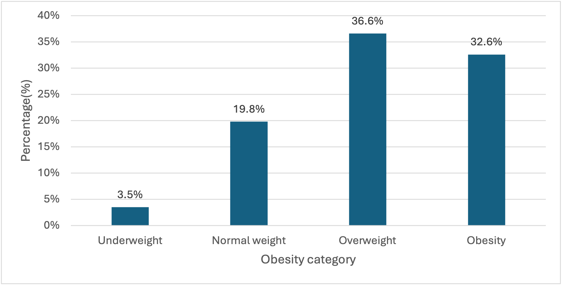 Out of 159 , 3.5% of participants were underweight, while 19.8% had a normal weight. Most of these participants were overweight (36.6%) and obese (32.6%) (Figure 1).