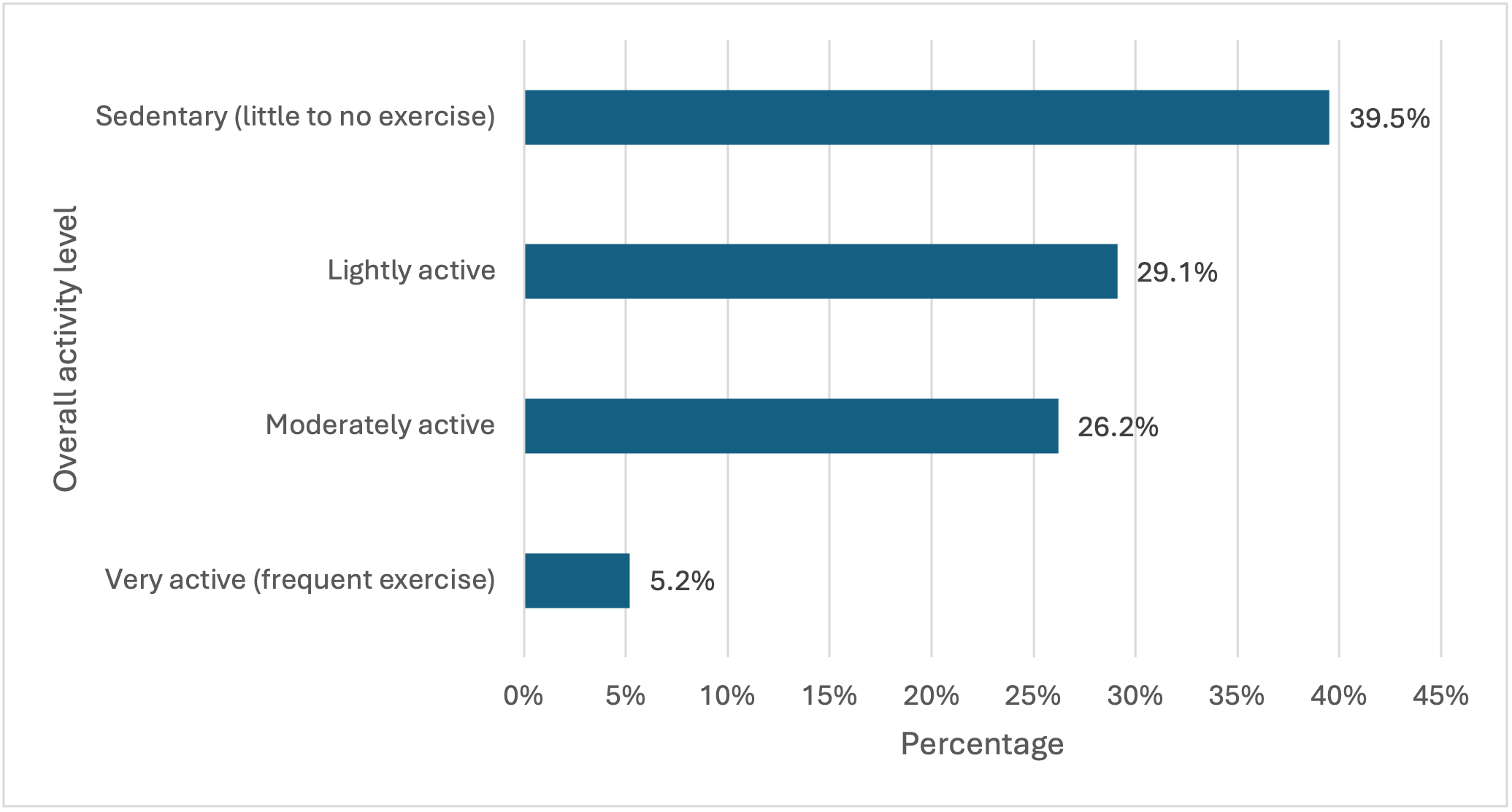 In terms of overall activities, a high proportion of participants 68(39.5%) did little to no exercise (sedentary lifestyle), and only 9(5.2%) were very active with frequent exercise. 50(29.1%) and 45(26.2%) practiced light and moderate active exercises, respectively (Figure 2).
