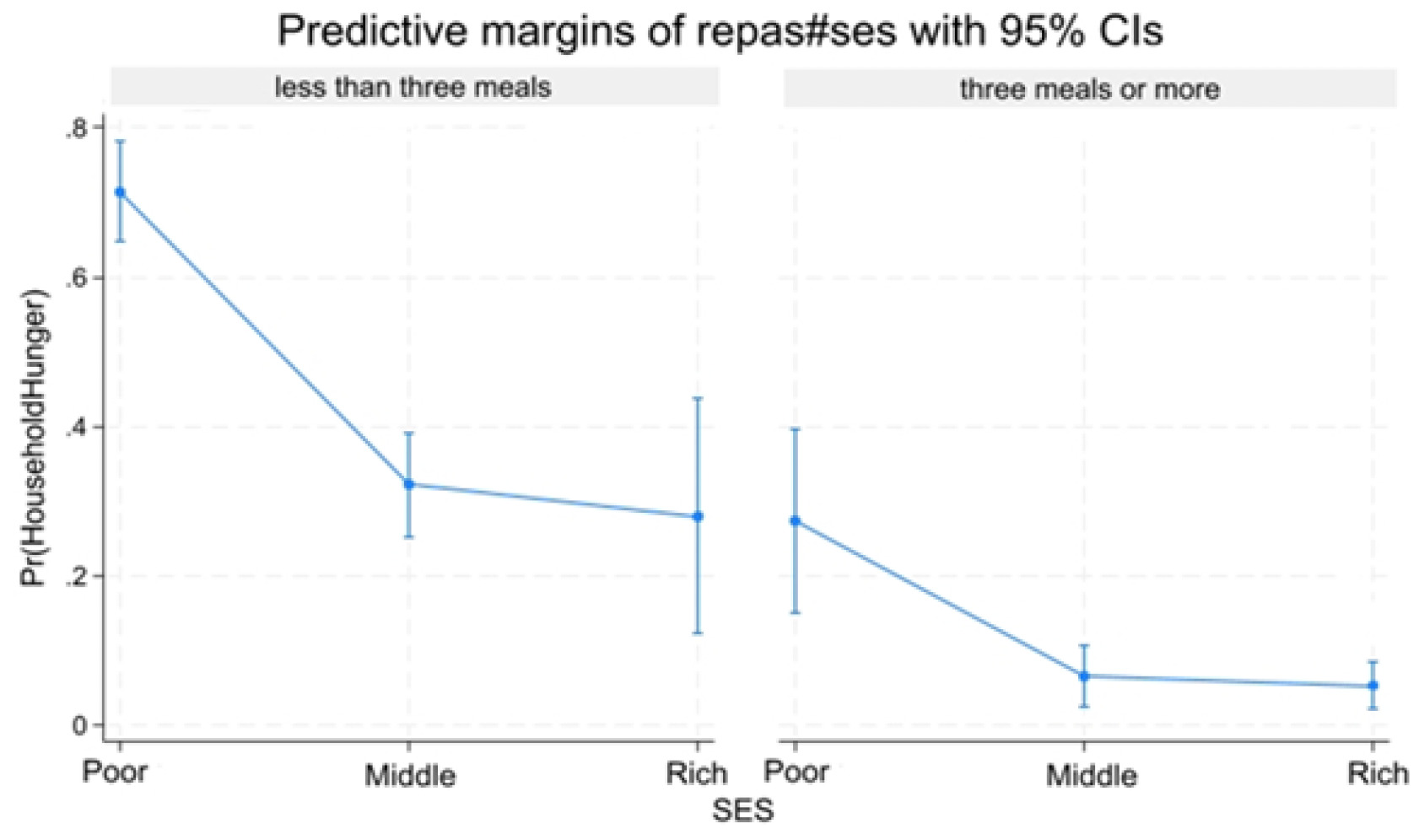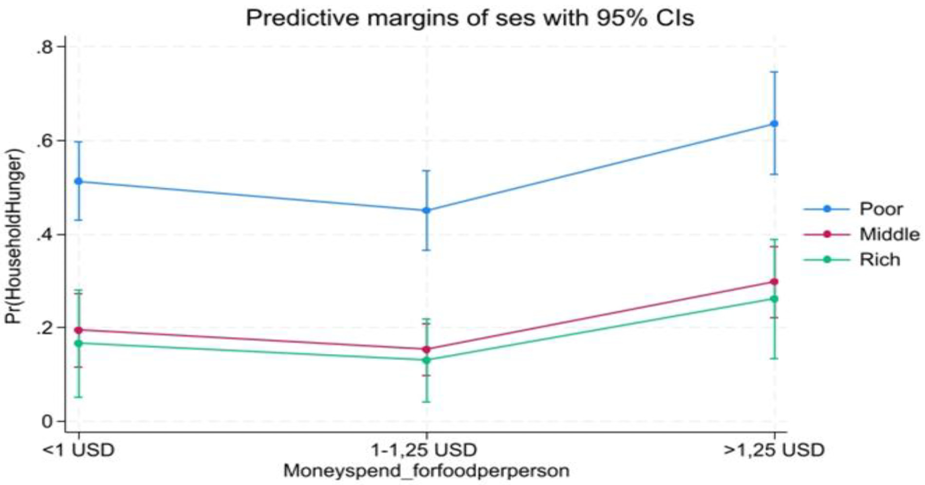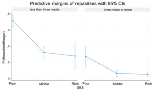 Socio-economic level and Household hunger: Predictive margins by money spend for meal per individual/day and meal’s number. Predictive margins of household hunger (Pr (HOUSEHOLD HUNGER)) change by SES and Meal.