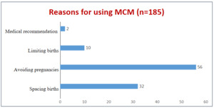 Regarding reasons for use, most women in Ndjili adopt MCMs to avoid pregnancy (56%), followed by birth spacing (32%). This aligns with national data: the 2023 DHS reported unmet needs of 22% for spacing and 10% for limiting births [25]. The 2018 MICS confirmed that birth control is a strong driver of adoption in precarious urban contexts, while Hamadou et al. in Niger highlighted how economic constraints reinforce the desire to limit family size.17 These findings underscore the importance of leveraging high adoption rates to further promote birth spacing, emphasizing its health benefits for mothers and children.7,18