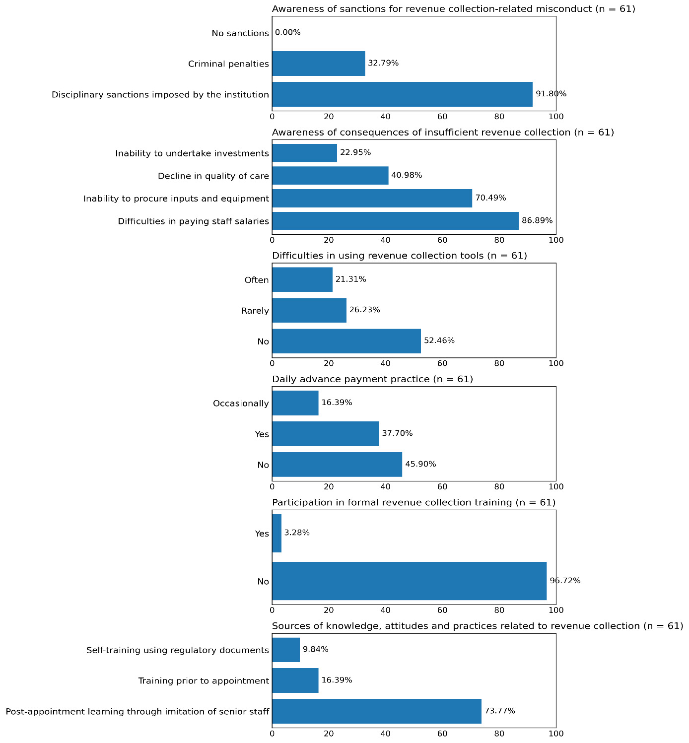 Almost all staff demonstrated good awareness of the stakes involved: 98.4% (60/61) correctly identified the negative consequences of inadequate revenue collection, including delays in salary payments, inability to procure equipment and potential deterioration in the quality of care (Figure 1). Disciplinary sanctions (91.8%) and criminal penalties (32.8%) were also cited as measures applicable in cases of misconduct. Difficulties in using available tools were frequently reported by 21.3% of respondents.