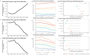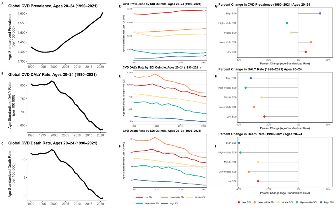 Our findings demonstrate an increase in the prevalence and burden of cardiovascular disease among young adults aged 20-24 years from 1990-2021, with a marked shift toward low- and low-middle-Sociodemographic Index regions and worsening metabolic risk profiles, particularly elevated body-mass index, as key contributors. This age group represents a critical window for early-life cardiovascular prevention, with substantial potential to alter long-term cardiovascular risk trajectories and reduce future disease burden.