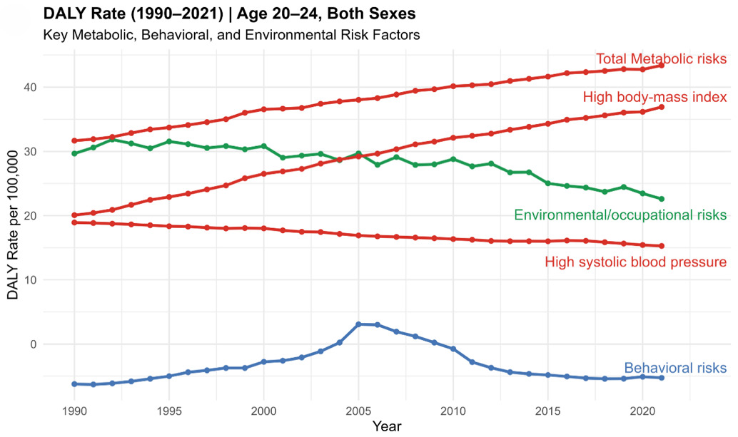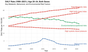 Temporal trends in disability-adjusted life year rates by risk factor from 1990-2021 were visualized using annual age-standardized estimates. All analyses and figures were generated in R (version 4.3.2; R Foundation for Statistical Computing).