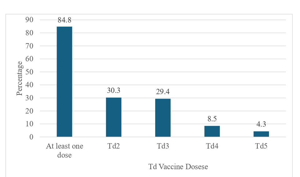 Most mothers (84.8%) received at least one dose of Tetanus-Diphtheria (TD) vaccination. Approximately one-third of mothers reported receiving the second and third doses, while very few (8.5% and 4.3%, respectively) received the fourth and fifth doses (Figure 3).