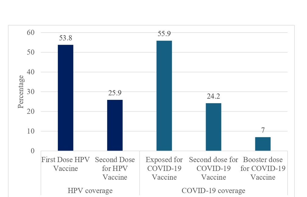 The coverage of the first (53.8%, 95% CI: 52.6-55.3) and second doses of HPV among adolescent girls was 53.8% (95% CI: 52.6-55.3) and 25.9%, respectively. About half (52.2%, 95% CI: 50.9-51.8) received the first dose of COVID-19, while 23.2% and 9.1% received second and booster doses of COVID-19, respectively (Figure 4).