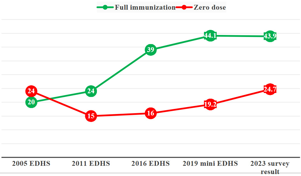The Ethiopian National Expanded Program on Immunisation (EPI) was launched with six antigens (BCG, DPT, Measles, and OPV) in 1980 and has made notable progress in increasing the number of antigens between 2011 and 2020 (including HepB-Hib, PCV, Rota, Td, HPV, and COVID-19 vaccines) and currently reached thirteen for life course immunisation.10 The country has made notable strides in increasing access to immunisation services in the last two decades. Between 2000 and 2019, the coverage of Penta3 increased from 21.1% to 61%, and the proportion of children fully immunised increased from 14.2% to 43%.11,12 Ethiopia has also achieved tremendous results in reducing deaths among children over the last two decades, including a 52% decline in under-5 mortality from 123 deaths per 1,000 live births in 2005 to 59 deaths per 1,000 live births in 2019. Over the same period, infant mortality declined from 77 to 47 deaths per 1,000 live births.13,14