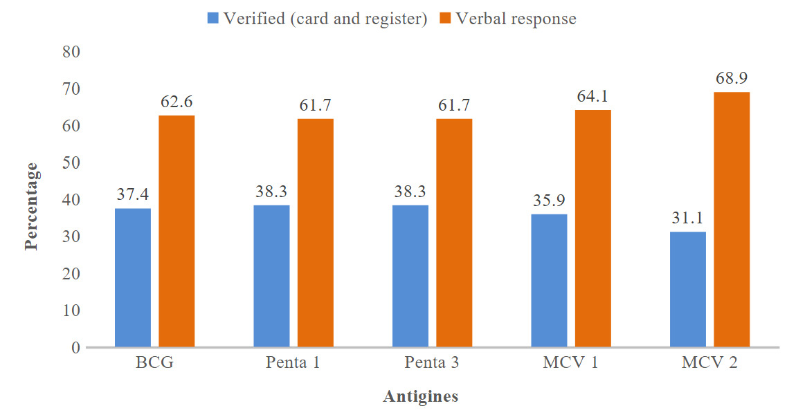 Assessment of vaccination card availability revealed that only 39.5% of respondents had a vaccination card. Among those without a card, 32.9% reported that the healthcare facility did not provide a vaccination card, 59.9% of them reported the card was lost, and 7.3% mentioned it had been torn or damaged. Vaccination status was verified through document checks (such as immunisation cards or registration records) or verbal confirmations from mothers and caregivers. The reported coverage for vaccine antigens, based on verbal responses, ranges from 61.7% to 68.9%, while the confirmed vaccine uptake, based on documentation, varies from 31.1% to 37.4% (Figure 1).