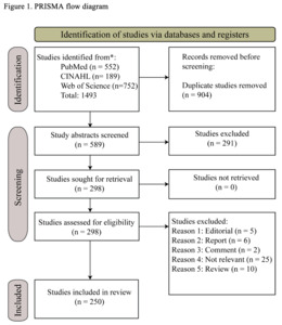 A total of 1493 articles were initially retrieved from PubMed (552), CINAHL (189), and Web of Science (752). After removing duplicates and screening abstracts, we reviewed 298 peer-reviewed articles in full. Of these articles, 48 were excluded for the following reasons based on the following criteria: editorial (n = 5), report (n = 6), comment (n = 2), not relevant (n = 25), or review (n=10). The remaining 250 articles were included in our analysis. Figure 1 highlights the selection process suggested by PRISMA guidelines.13
